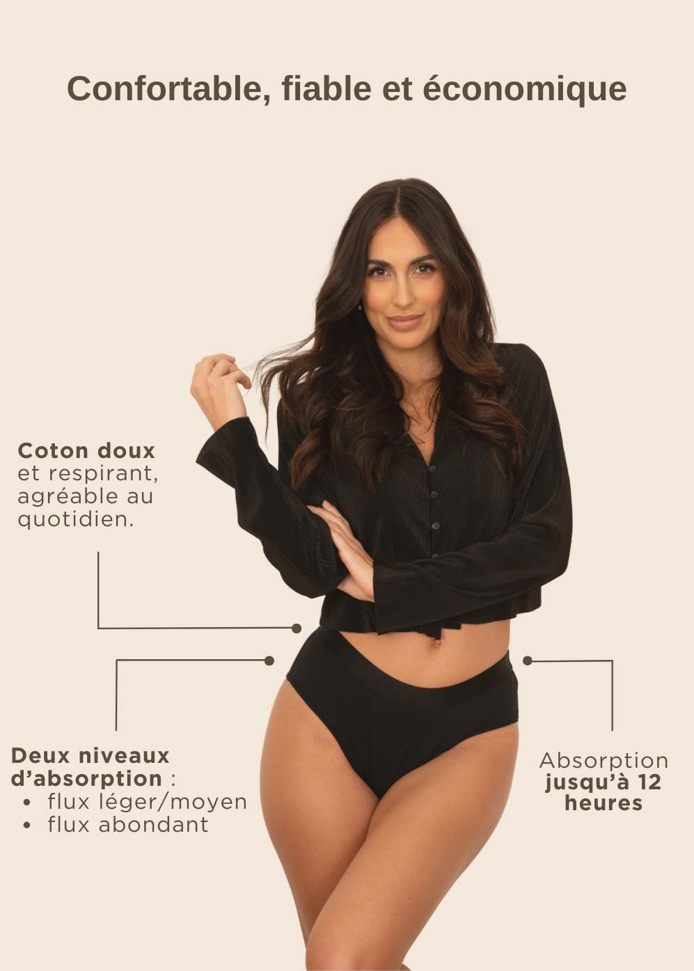 - si vous avez un flux léger, vous pouvez choisir une culotte menstruelle à faible absorption ; telle qu’une version “Jour” ou une culotte de la gamme “Daily” (nude et sans coutures).