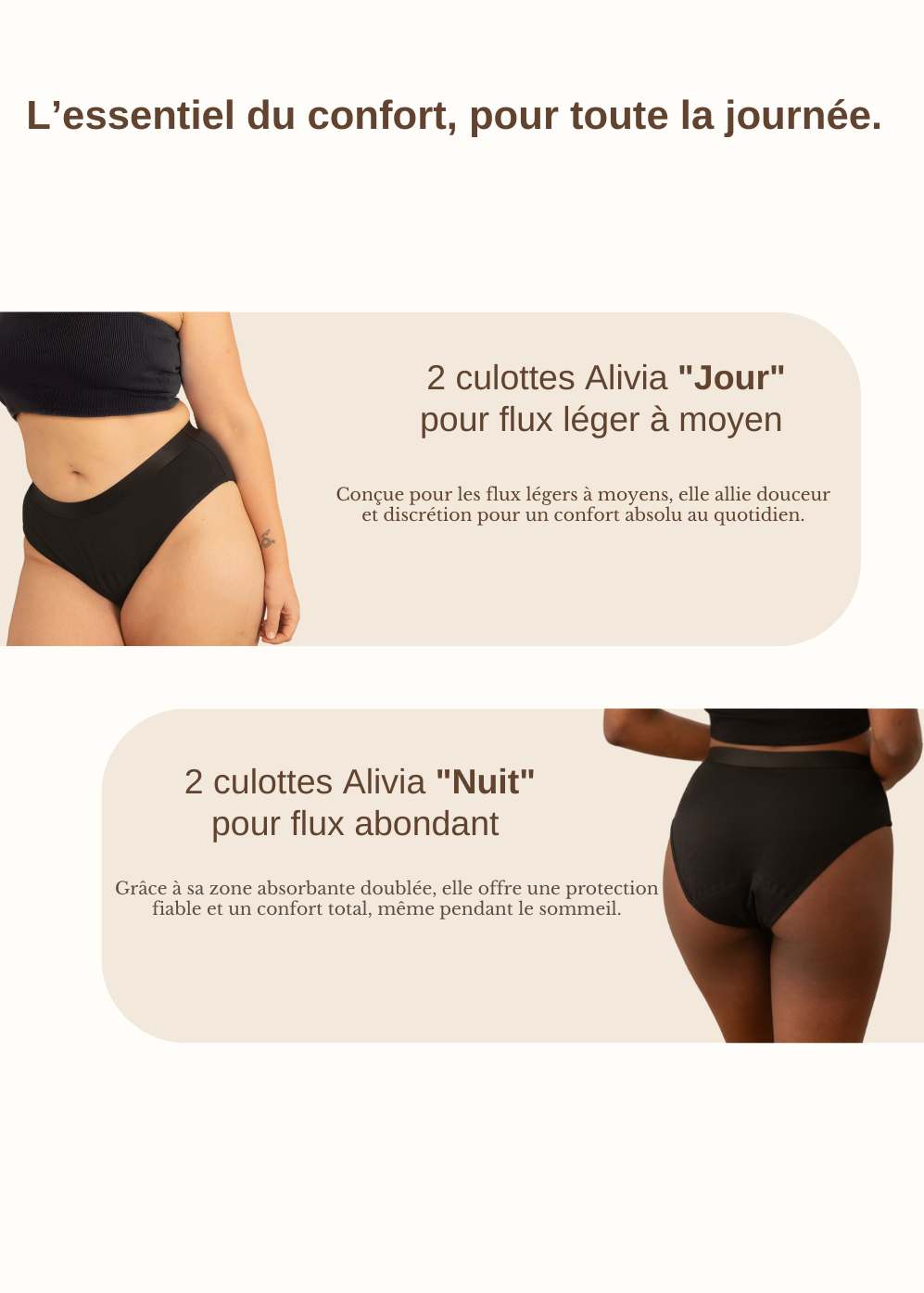 - si vous avez un flux abondant, vous aurez besoin d'une culotte menstruelle à haute absorption ; telle qu’une version “Nuit” ou une culotte de la gamme “Effusia”.